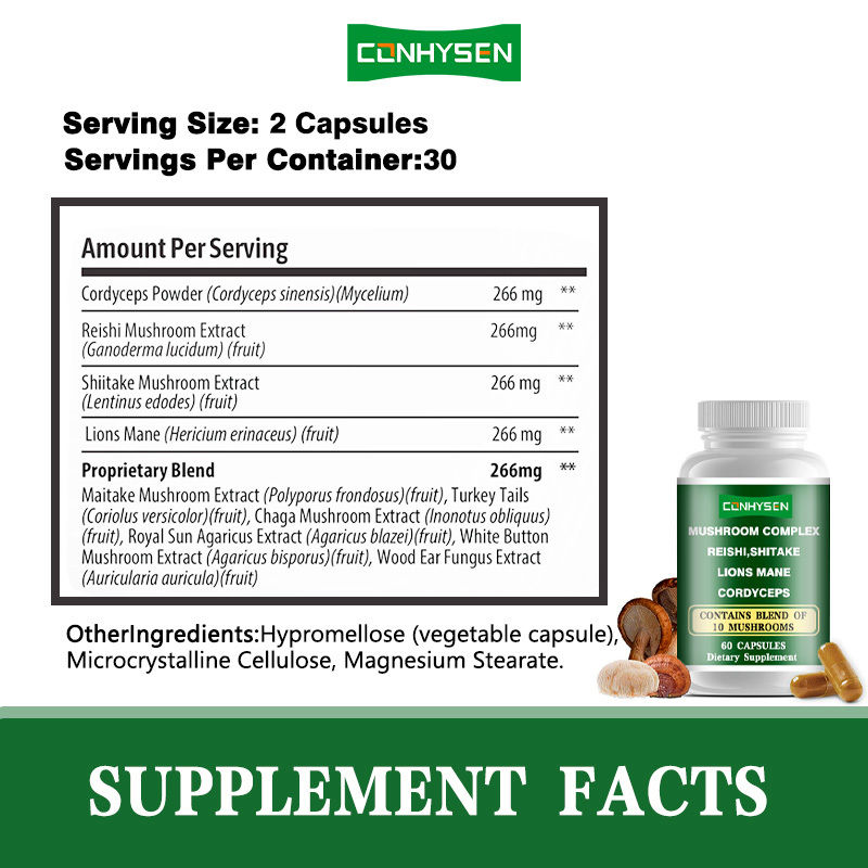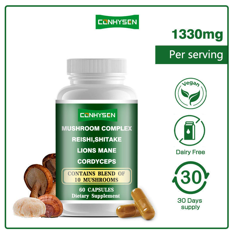 Капсулы Mushroom Complex - это пищевая добавка, которая научно разработана и очищена из различных функциональных грибов, таких как Рейши, Шиитаке, мицелий Лингдзи и Тремелла.Он содержит ценные активные ингредиенты, такие как полисахариды., терпеноиды, эрготионин и минералы из этих грибов, действующие как естественный хранилище здоровья, обеспечивающее многомерную защиту здоровья человеческого организма.