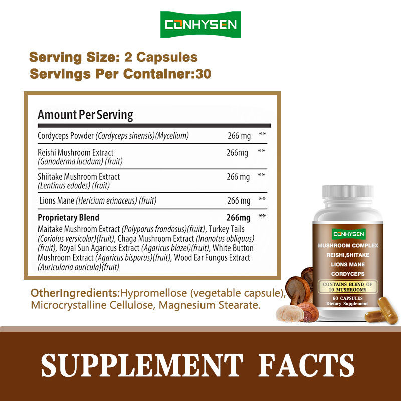 Mushroom Complex Capsules - это пищевая добавка, которая сочетает в себе сущность различных лекарственных грибов.Он приобрел популярность среди современных потребителей благодаря своей уникальной натуральной формуле и широким преимуществам для здоровья.Эти продукты обычно содержат экстракты традиционных лекарственных грибов, таких как Рейши, Кордицепс, Тремелла и Аурикулярия.и сформулированы с помощью научных соотношений в легко усваиваемой форме капсул, предоставляя удобное решение для питательных добавок для тех, кто ищет здоровый образ жизни.