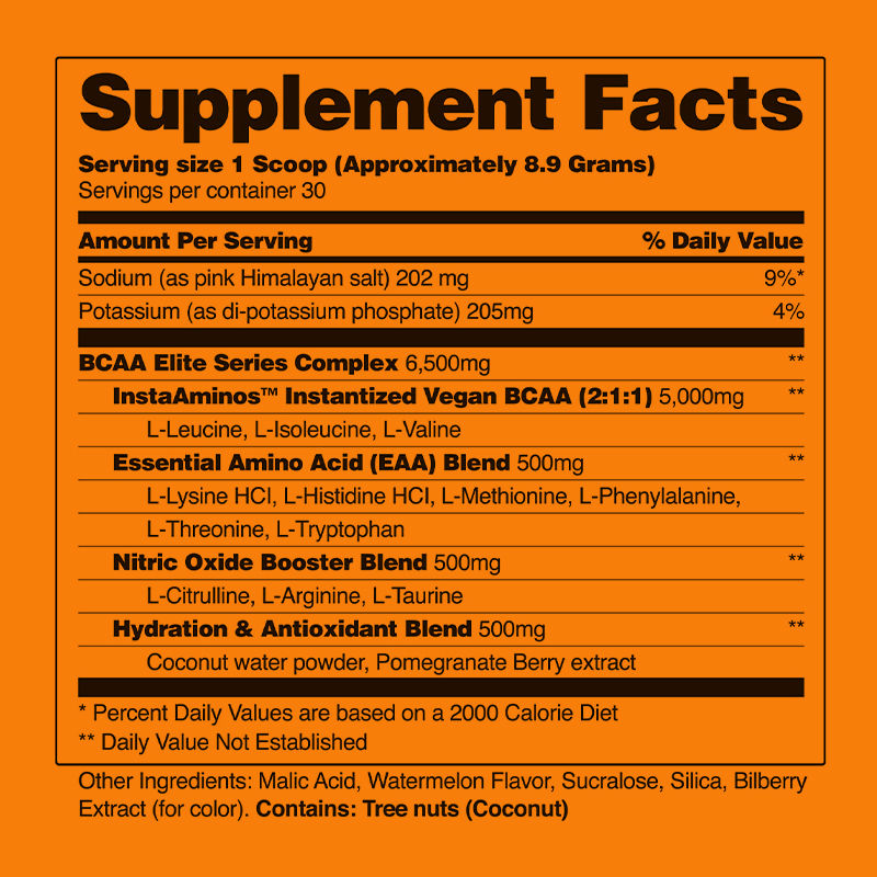 Ингредиенты:Натрий, калий, BCAA Elite Series Complex, инстанцированный веганский BCAA, смесь из незаменимых аминокислот, смесь для усиления оксида азота, смесь для гидратации и антиоксидантов