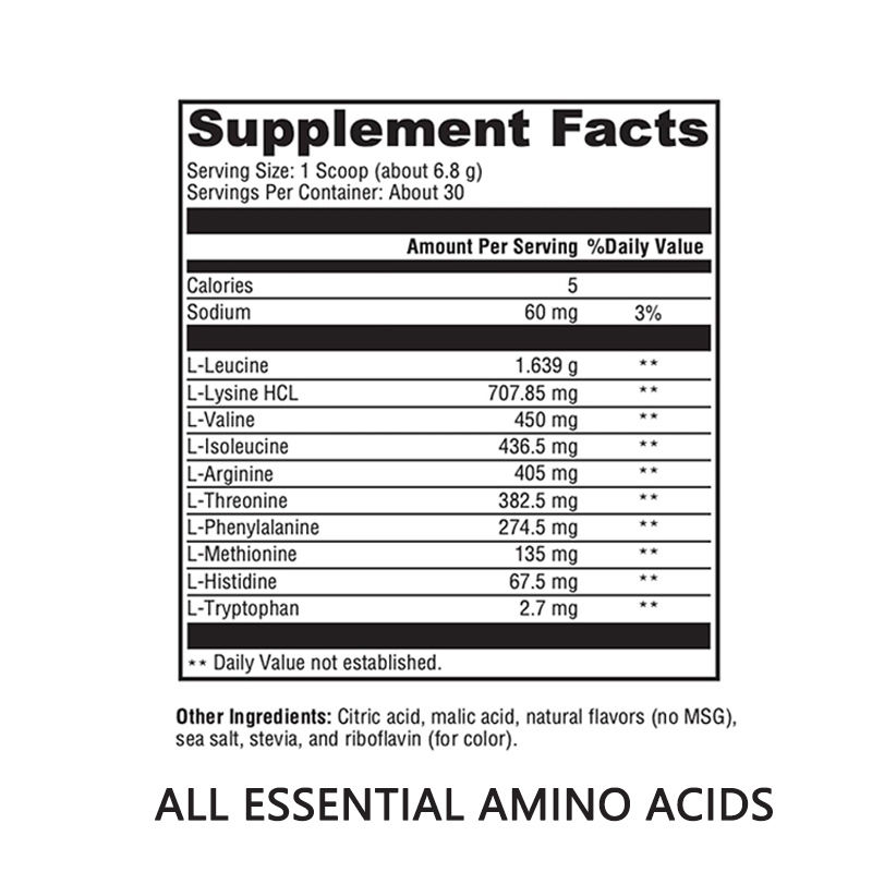 L-лейцин, L-изолейцин, L-валин, L-лизин HCL, L-аргинин, L-треонин, L-фенилаланин, L-метионин, L-гистидин, L-триптофан