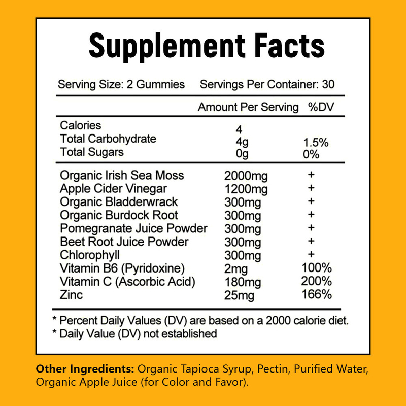 Органический ирландский морской мёс, органический мочевой пузырь, органический корень бордока, яблочный уксус, гранатовый сок в порошке, сок из свеклы в порошке, цинк, витамин В6, витамин С, хлорофилл