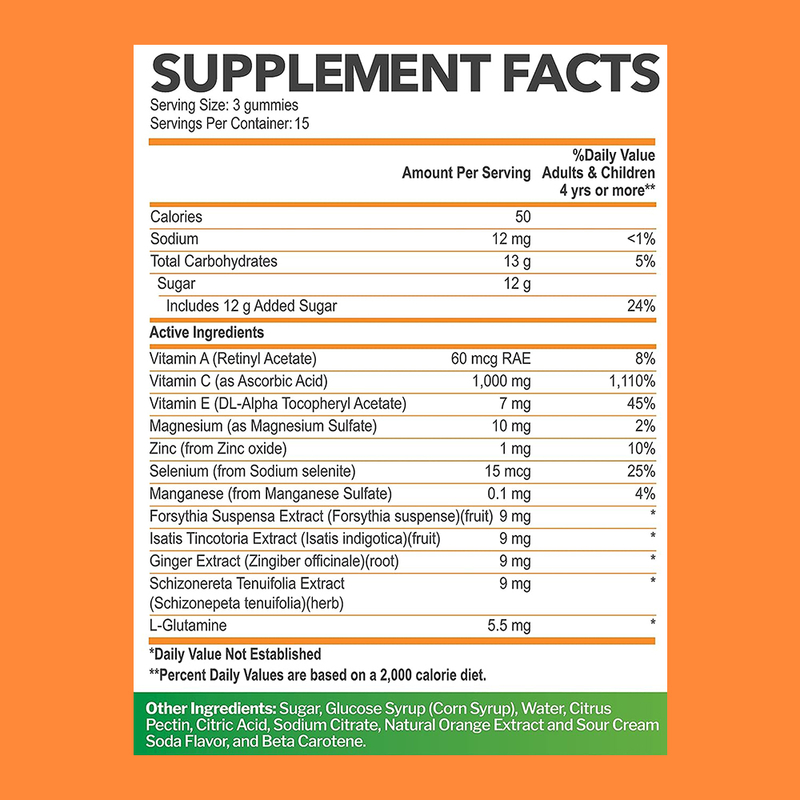 Витамин С, витамин А, витамин Е, цинк, магний, селен, марганец, экстракт имбиря, экстракт форситии суспенса, экстракт иссатиса тинкотории, экстракт шизонереты тенифолии, L-глутамин