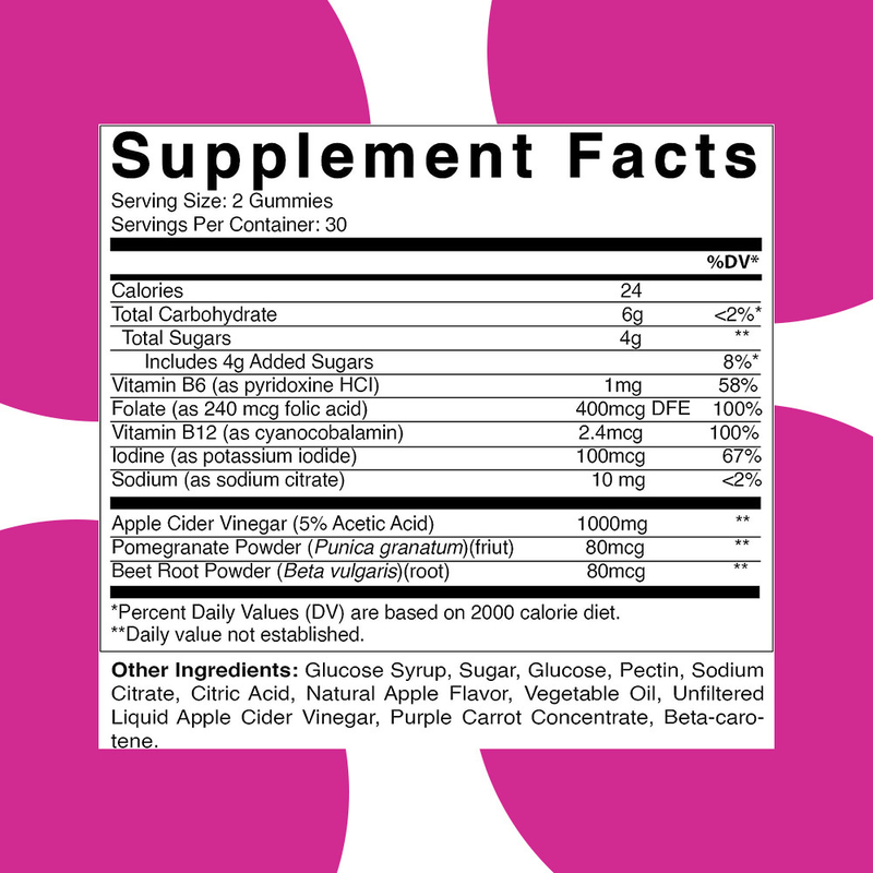 Яблочный уксус, витамин В6, фолиевая кислота, витамин В12, йод, натрий, гранатный порошок, порошок из корней свеклы