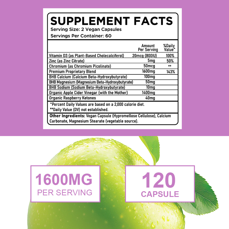Органический яблочный уксус, витамин D3, цинк, хром, премиальная запатентованная смесь, BHB кальций, BHB магний, BHB натрий, органические малиновые кетоны
